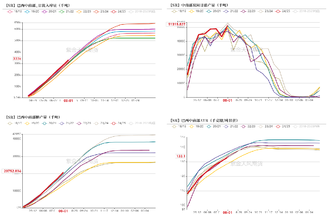 2024/25榨季截至7月下半月,巴西中南部地区累计入榨量为33288.4万吨,较去年同期的31212.2万吨增加2076.2万吨,同比增幅达6.65%;甘蔗ATR为133.10kg/吨,较去年同期的132.92kg/吨增加0.18kg/吨;累计制糖比为49.16%,较去年同期的48.62%增加0.54%。累计产糖量为2075.3万吨,较去年同期的1921.9万吨增加153.4万吨,同比增幅达7.98%。